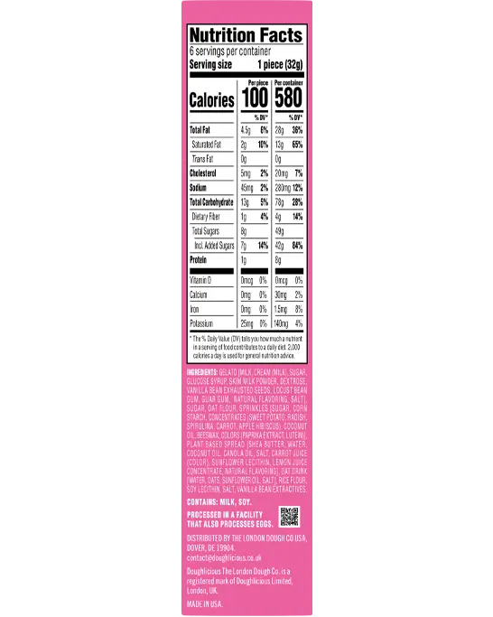 Ingredients: Gelato [Milk, Cream (Milk), Sugar, Glucose Syrup, Skim Milk Powder, Dextrose, Vanilla Bean Exhausted Seeds, Locust Bean Gum, Guar Gum,  Natural Flavoring, Salt], Sugar, Oat Flour, Sprinkles [Sugar, Corn Starch, Concentrates (Sweet Potato, Radish, Spirulina, Carrot, Apple Hibiscus), Coconut Oil, Beeswax, Colors (Paprika Extract, Lutein)], Plant Based Spread [shea Butter, Water, Coconut Oil, Canola Oil, Salt, Carrot Juice (Color), Sunflower Lecithin, Lemon Juice Concentrate, Natural Flavoring], Oat Drink [Water, Oats, Sunflower Oil, Salt], Rice Flour, Soy Lecithin, Salt, Vanilla Bean Extractives.